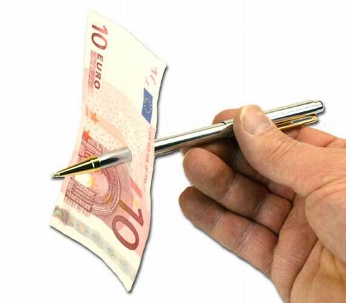 Vor den entsetzten Augen des Besitzers rammen Sie den Kugelschreiber mitten durch die Banknote und ziehen ihn komplett hindurch.