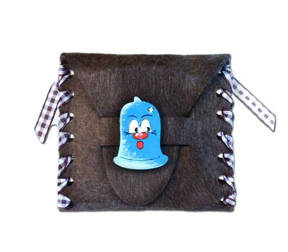 Lustige Taschen für Verhüterli´s mit handbemalten Kondomis in verschiedenen Farben aus Holz.