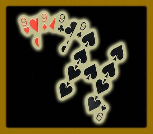 Nun drehen Sie die Karten um und ein Zuschauer steckt die vier Neuner an einer beliebigen Stelle in das Spiel zurück. Jetzt mischen Sie die Karten. Sie können auch Ihren Zuschauern die Karten zum Mischen geben. Nun machen Sie 3 Päckchen á 4 Karten. Einem Ihrer Zuschauer stellen Sie jetzt folgende Frage: Welches Päckchen sollen Sie jetzt wegnehmen? Der Zuschauer sagt das Päcken in der Mitte. Sie nehmen das Päckchen in der Mitte auf, fragen Ihn woher er seine magischen Fähigkeiten habe und legen eine Karte nach dem anderen vor den Augen aller mit der Bildseite nach oben auf den Tisch.