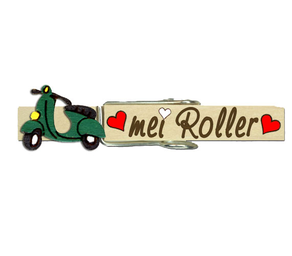 Wäscheklammer mit Text und einem dunkelgrünen Roller