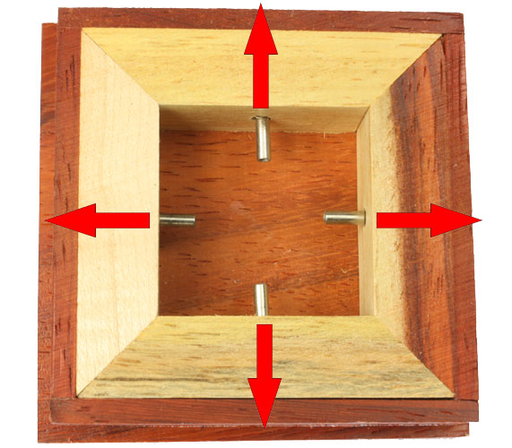 Das Zauberwort heißt Fliehkraft. Sie drehen die Kiste auf dem Tisch so schnell, dass diese in Kraft tritt. Dadurch werden die 4 in der Box locker sitzenden Stifte nach außen gedrückt und sie können den Deckel abheben.